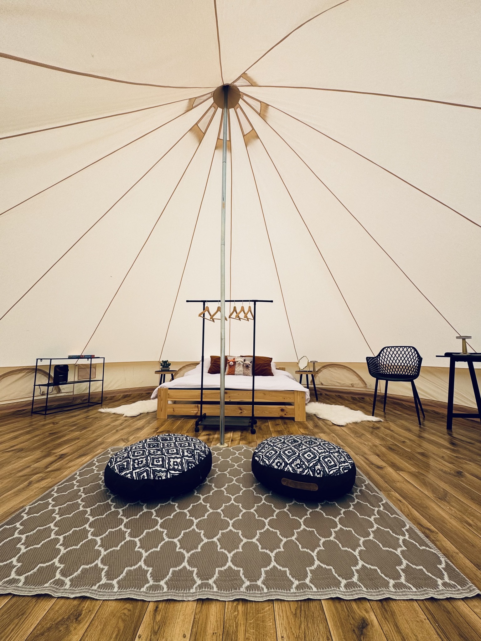 Zrelaksuj się w naszym stylowym namiocie, idealnym na romantyczny wypad lub weekendowy odpoczynek. Ciesz się komfortem małżeńskiego łoża, otoczonego pięknem natury i bliskością jeziora. Nasz namiot wyposażony jest w wygodny stół i krzesło, gdzie możesz delektować się poranną kawą lub wieczornym widokiem. Z prywatnym dostępem do jeziora, możesz zanurzyć się w krystalicznie czystej wodzie lub po prostu podziwiać malownicze krajobrazy. To idealne miejsce na ucieczkę od codzienności!