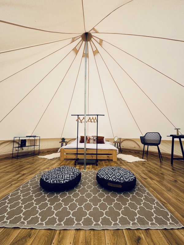 Komfortowy namiot glampingowy z widokiem na jezioro o powierzchni 28 m².